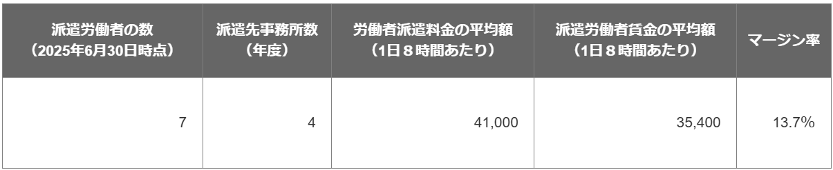 ※賃⾦には、基本給、賞与、時間外⼿当、深夜・休⽇⼿当、通勤⼿当が含まれます。 ※マージンには、法定福利費、福利厚⽣費、教育訓練費、会社運営費などが含まれます。 ■労使協定に関する事項 労働者派遣法第30条の4第1項の労使協定を締結しているか否か 締結している 当該労使協定の対象となる派遣労働者の範囲 全ての派遣労働者 ■教育訓練に関する事項(※労働者実費負担無し、有給) 内定者研修、新⼊社員研修、新⼊社員OJT、階層別研修、 全社共通研修(情報セキュリティ研修、外国言語習得研修)、 テーマ別研修、 技術研修(社外セミナーやe-learning制度を使⽤した各種教育)、資格取得奨励制度など。